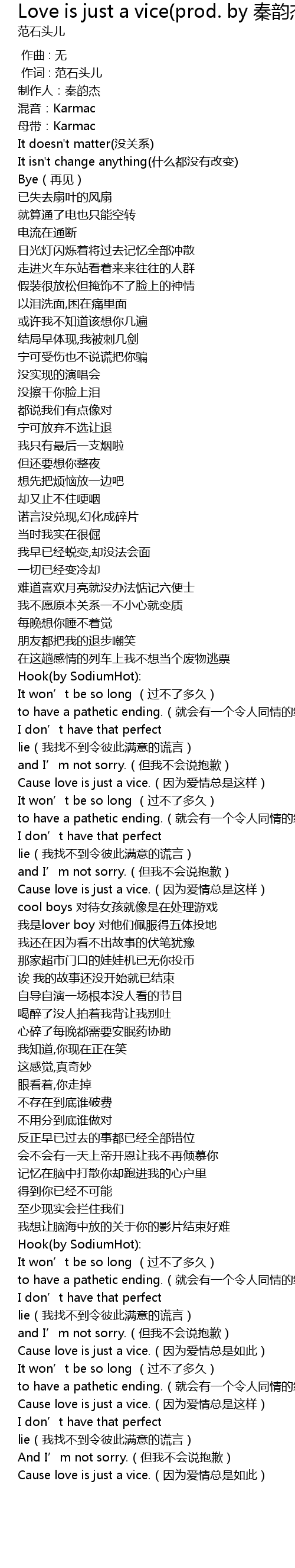 | [03:53.53] | Cause love is just a vice. yīn wèi ài qíng zǒng shì rú cǐ |