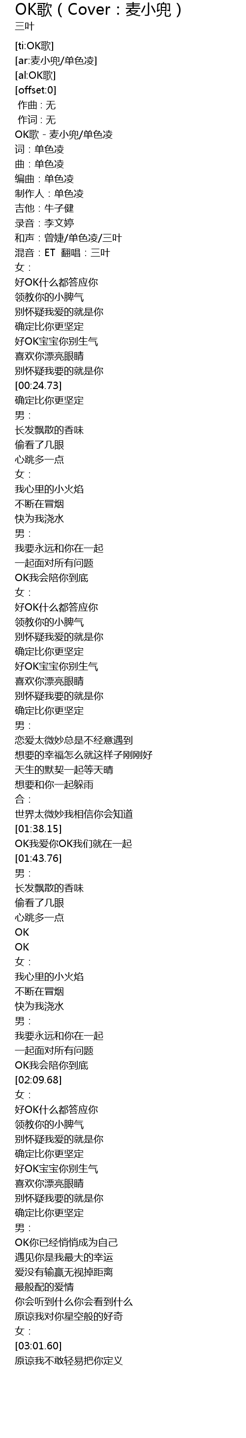 | [00:00.10] | OK歌 - 麦小兜/单色凌 |
