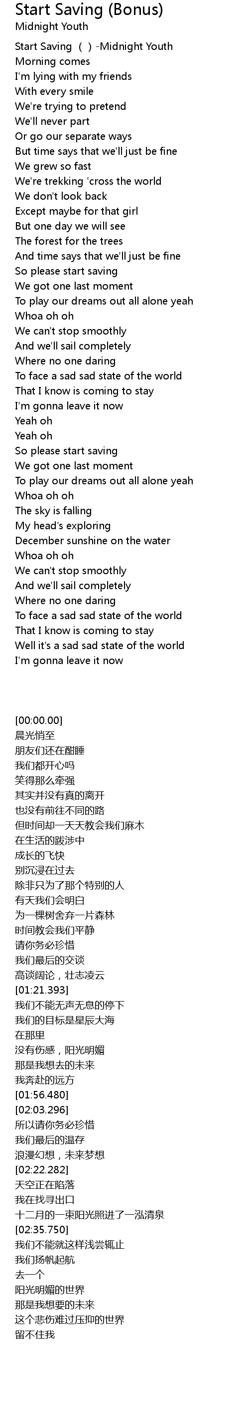 | [00:00.00] | Start Saving ()-Midnight Youth |