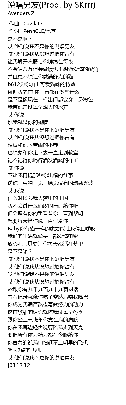| [03:13.03] | 哎 他们说我不是你的说唱男友 |