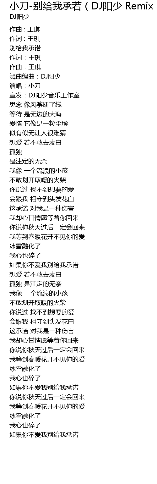 | Song | 小刀-别给我承若(DJ阳少 Remix) |