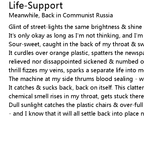 It curdles over orange plastic, spatters the newspaper & and I'm neither relieved nor dissappointed sickened & numbed over - yet underneath this, a quick thrill fizzes my veins, sparks a separate life into me.