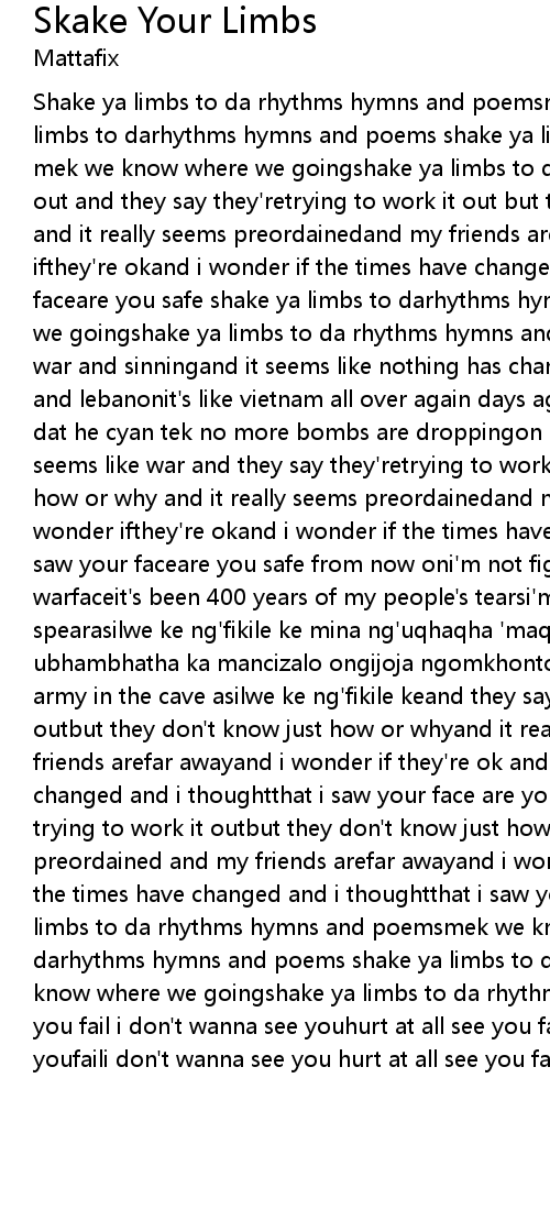 Shake ya limbs to da rhythms hymns and poemsmek we know where we going shake ya limbs to darhythms hymns and poems shake ya limbs to darhythms hymns and poems mek we know where we goingshake ya limbs to da rhythms hymns and poemswork it out and they say they'retrying to work it out but they don't knowjust how or why and it really seems preordainedand my friends are far away and i wonder ifthey're okand i wonder if the times have changedand i thought that i saw your faceare you safe shake ya limbs to darhythms hymns and poems mek we know where we goingshake ya limbs to da rhythms hymns and poemsfrom the beginning there was war and sinningand it seems like nothing has changedbombs are dropping on iraq and lebanonit's like vietnam all over again days ago abredrin that i knowtell me dat he cyan tek no more bombs are droppingon iraq and lebanon and everywhereit seems like war and they say they'retrying to work it out but they don't knowjust how or why and it really seems preordainedand my friends are far away and i wonder ifthey're okand i wonder if the times have changedand i thought that i saw your faceare you safe from now oni'm not fighting fair it's guerilla warfaceit's been 400 years of my people's tearsi'm like shaka with a hungry spearasilwe ke ng'fikile ke mina ng'uqhaqha 'maqinsoubaba ung'biza ucath'impi ubhambhatha ka mancizalo ongijoja ngomkhonto once a slave and now abravei got my army in the cave asilwe ke ng'fikile keand they say they're trying to work it outbut they don't know just how or whyand it really seems preordained and my friends arefar awayand i wonder if they're ok and i wonderif the times have changed and i thoughtthat i saw your face are you safeand they say they're trying to work it outbut they don't know just how or whyand it really seems preordained and my friends arefar awayand i wonder if they're ok and i wonderif the times have changed and i thoughtthat i saw your face are you safeshake ya limbs to da rhythms hymns and poemsmek we know where we going shake ya limbs to darhythms hymns and poems shake ya limbs to darhythms hymns and poems mek we know where we goingshake ya limbs to da rhythms hymns and poemsi don't wanna see you fail i don't wanna see youhurt at all see you fail i don't wanna see youfaili don't wanna see you hurt at all see you fail |
