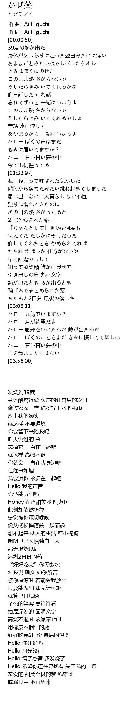 | [03:19.50] | ハロー 風邪をひいたんだ 熱が出たんだ |