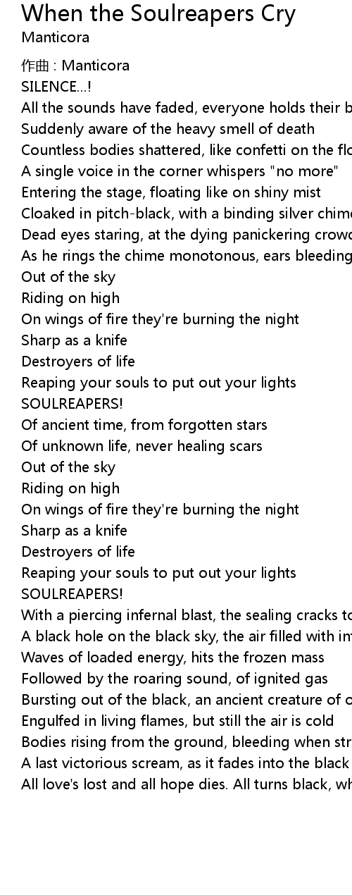 | All love' s lost and all hope dies. All turns black, when the soulreapers cry |