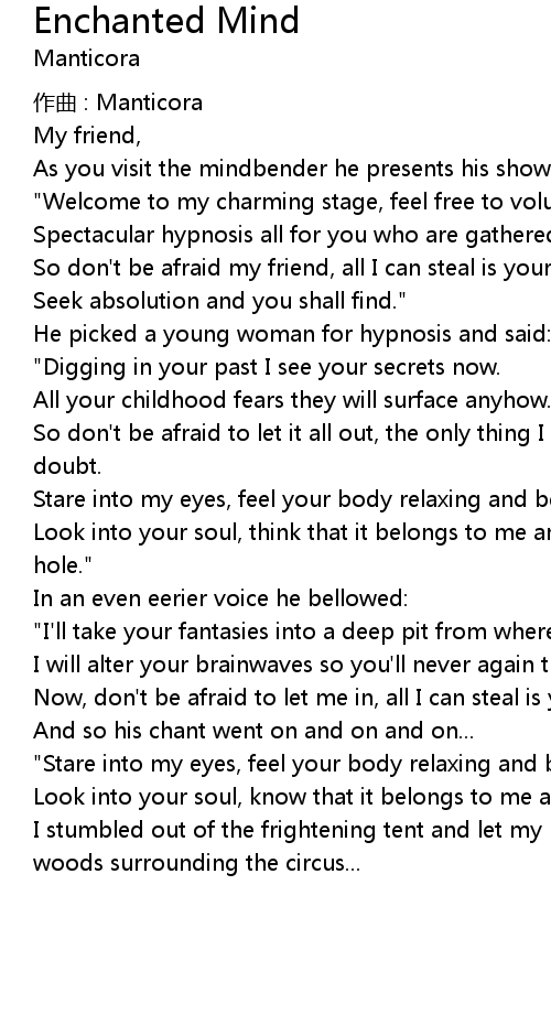 | "Stare into my eyes, feel your body relaxing and believe in my lies. | |
