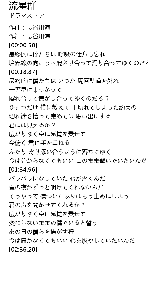 | [00:45.51] | 一等星に乗っかって 擦れ合って焦がし合ってゆくのだろう |