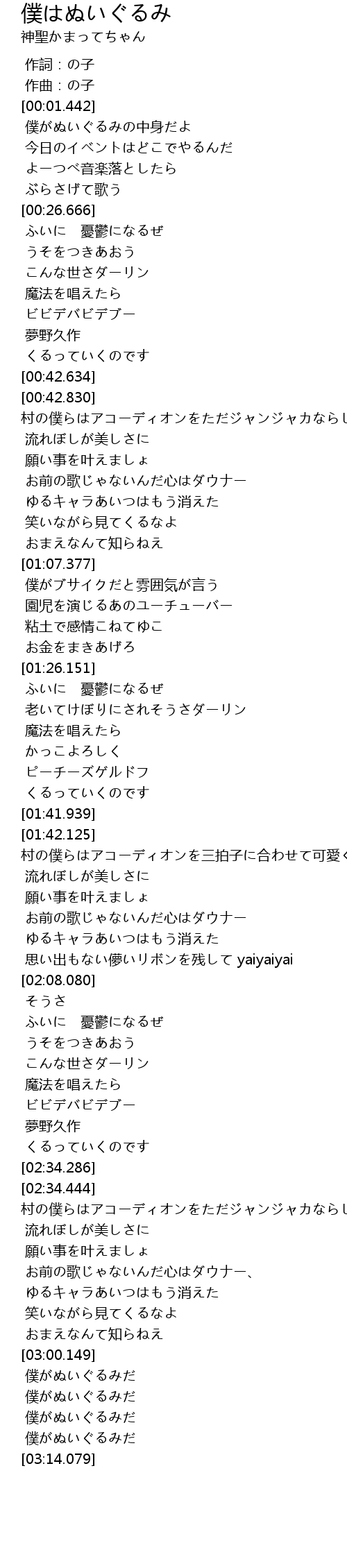 | [03:03.357] | 僕がぬいぐるみだ |