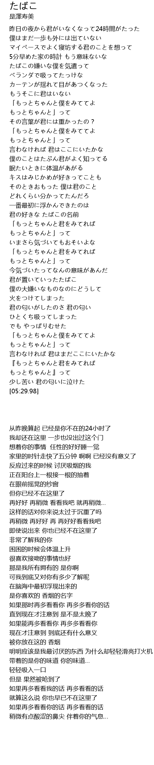 | [04:06.96] | 君が置いていったたばこ |