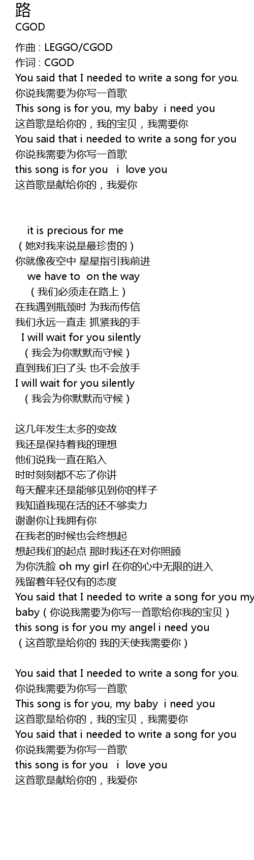 | You said that I needed to write a song for you my baby nǐ shuō wǒ xū yào wèi nǐ xiě yī shǒu gē gěi nǐ wǒ de bǎo bèi | |