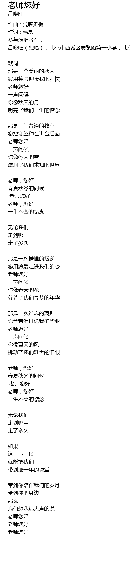 | lǚ xiǎo wàng dú chàng, běi jīng shì xī chéng qū zhǎn lǎn lù dì yī xiǎo xué, běi jīng xiǎo xué, běi jīng shì dì yī qī yī zhōng xué, běi jīng shì dà yù zhōng xué, huá běi diàn lì dà xué, běi jīng lín yè dà xué | |