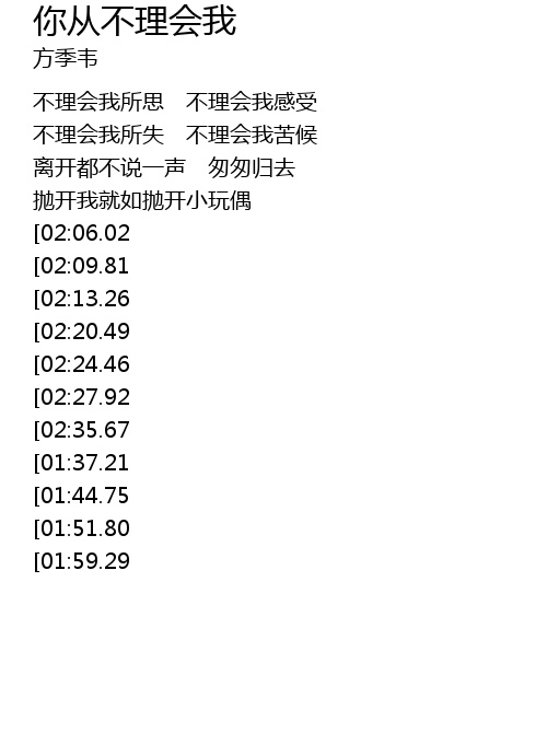 | [03:21.21][01:37.21] | 不理会我想哭 不理会我忍受 |