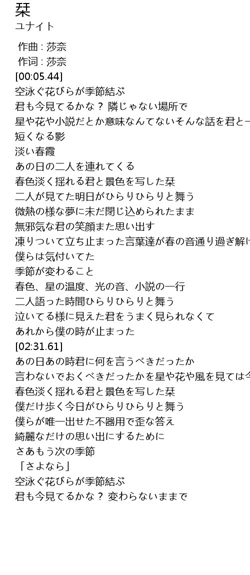 | [03:43.64] | 空泳ぐ花びらが季節結ぶ |