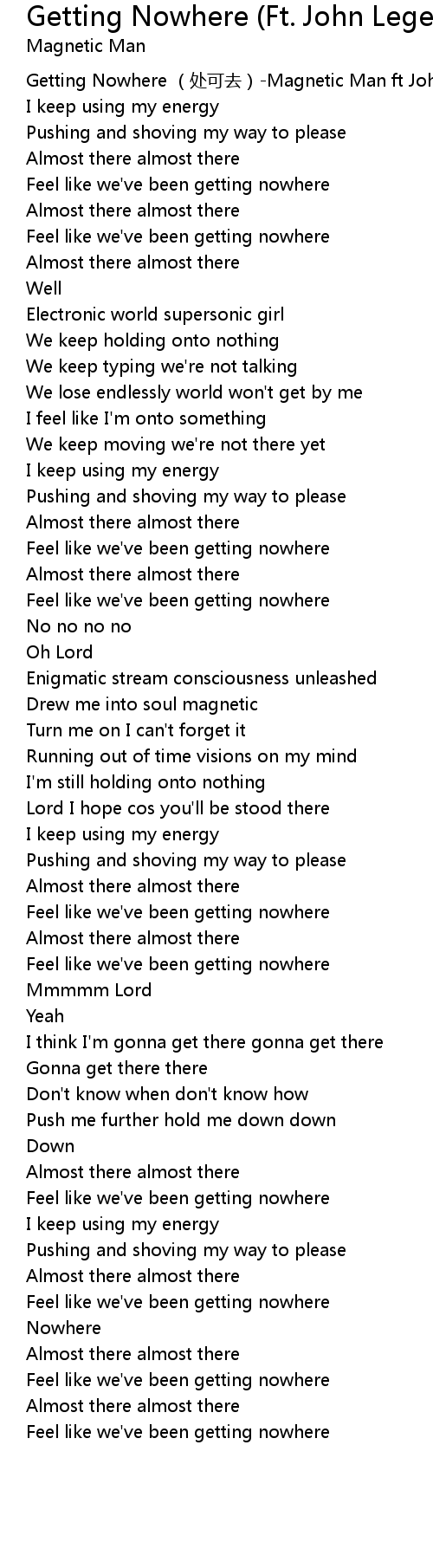 | [00:00.00] | Getting Nowhere chù kě qù Magnetic Man ft John Legend |