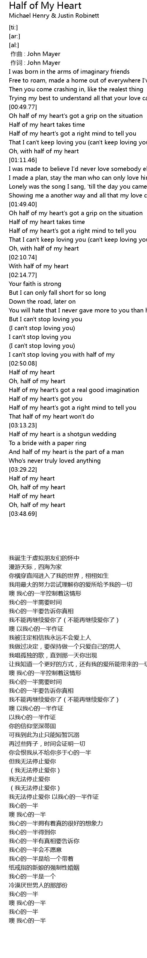 | [01:58.64] | Half of my heart' s got a right mind to tell you |