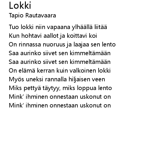 | [01:40.325] | On elämä kerran kuin valkoinen lokki |
