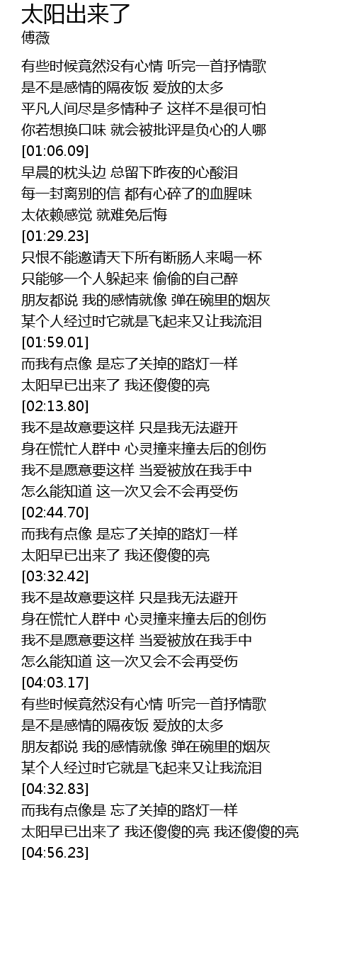 | [04:42.10] | 太阳早已出来了 我还傻傻的亮 我还傻傻的亮 |
