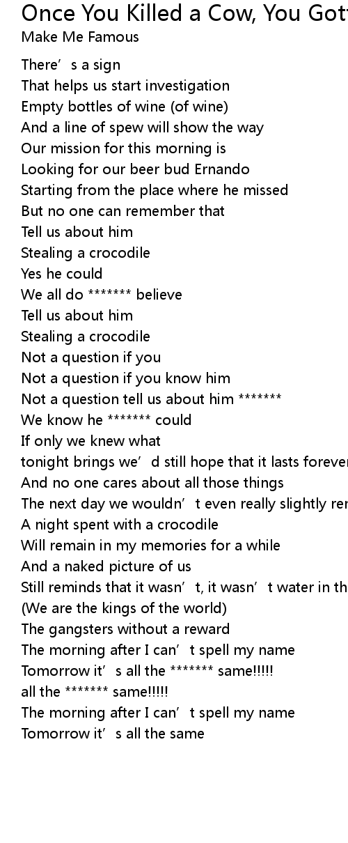 | Song | Once You Killed a Cow, You Gotta Make a Burger |