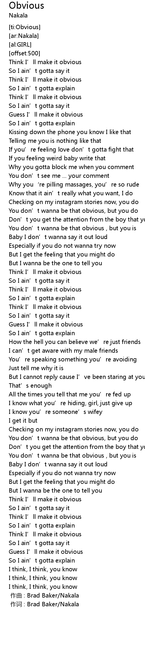 | [00:00.000] | 作词 : Brad Baker/Nakala |