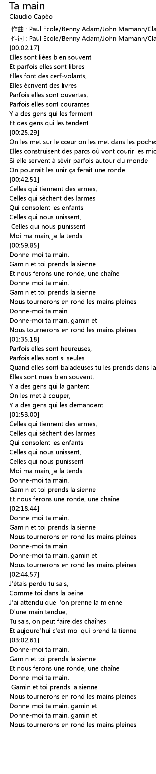 | [02:58.73] | Et aujourd'hui c'est moi qui prend la tienne |