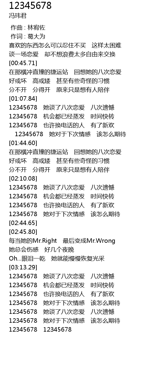 | [03:13.45] | 12345678 她谈了八次恋爱 八次遗憾 |