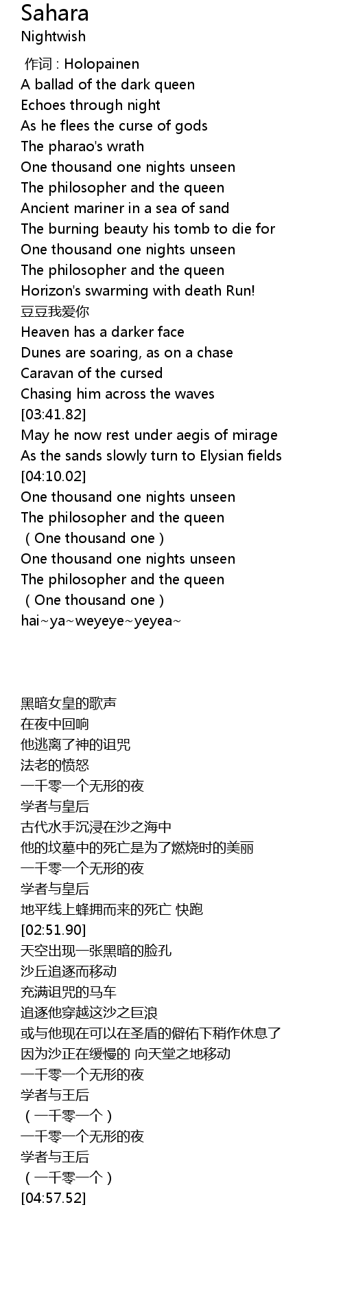 | [04:33.56] | One thousand one nights unseen |