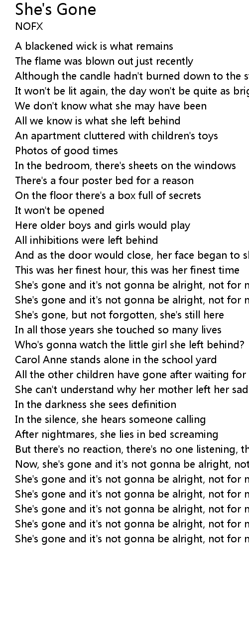 She's gone and it's not gonna be alright, not for me she's gone |