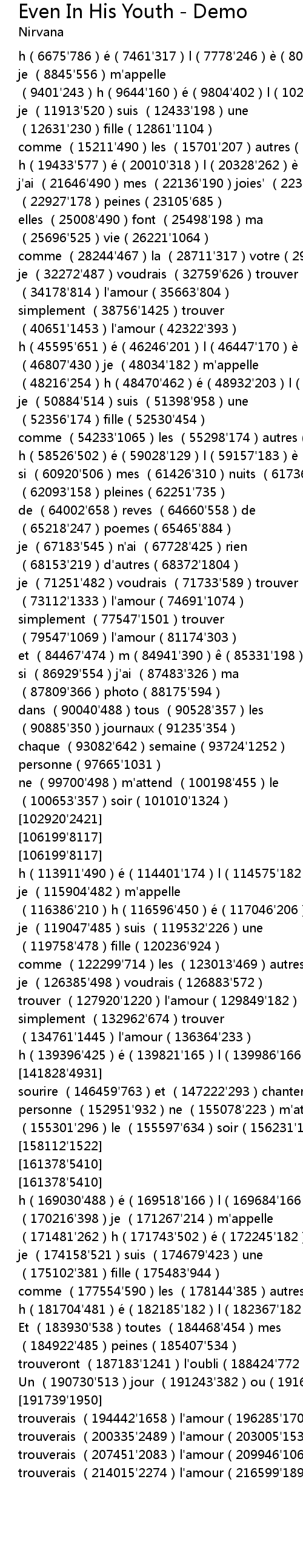 | [169030'4279] | h 169030' 488e 169518' 166 l 169684' 166e 169850' 366 ne' 170216' 398 je 171267' 214 m' appelle 171481' 262 h 171743' 502e 172245' 182 l 172427' 198e 172625' 254 ne 172879' 422 |