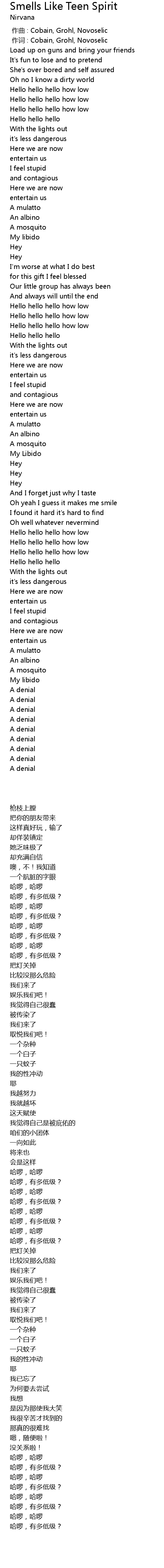 | [00:01.00] | 作词 : Cobain, Grohl, Novoselic |