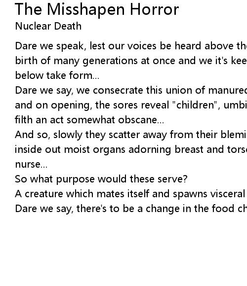 Dare we say, we consecrate this union of manured flesh upon which boils lester and on opening, the sores reveal "children", umbilical cords receiving liquid filth an act somewhat obscane... |