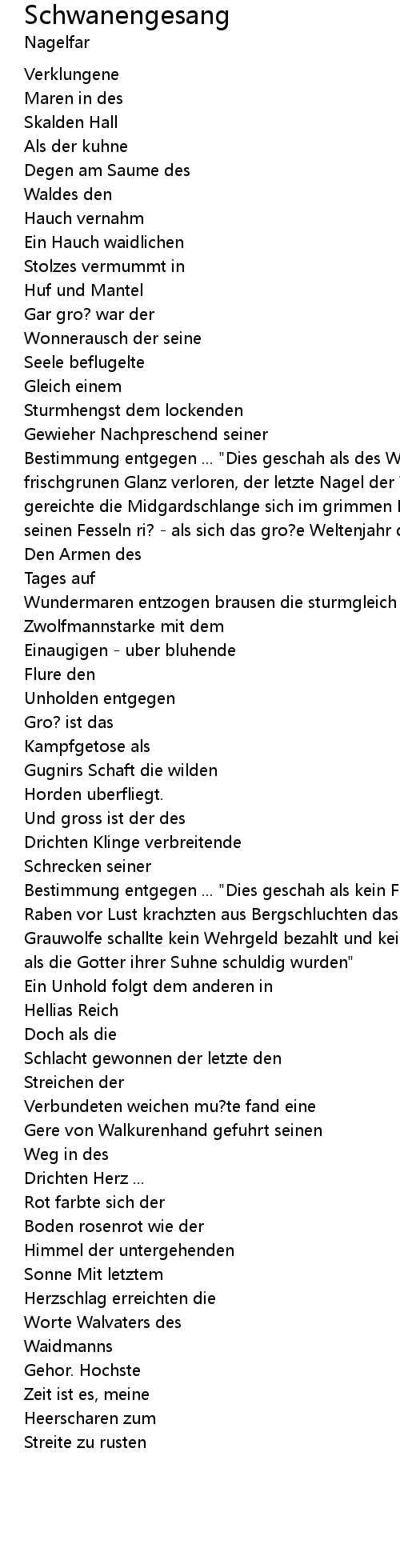 Bestimmung entgegen ... "Dies geschah als kein Fruhling mehr nahen wollte, die Raben vor Lust krachzten aus Bergschluchten das Freudengeheul blutgieriger Grauwolfe schallte kein Wehrgeld bezahlt und keine Freundeshand begraben wurde als die Gotter ihrer Suhne schuldig wurden" |