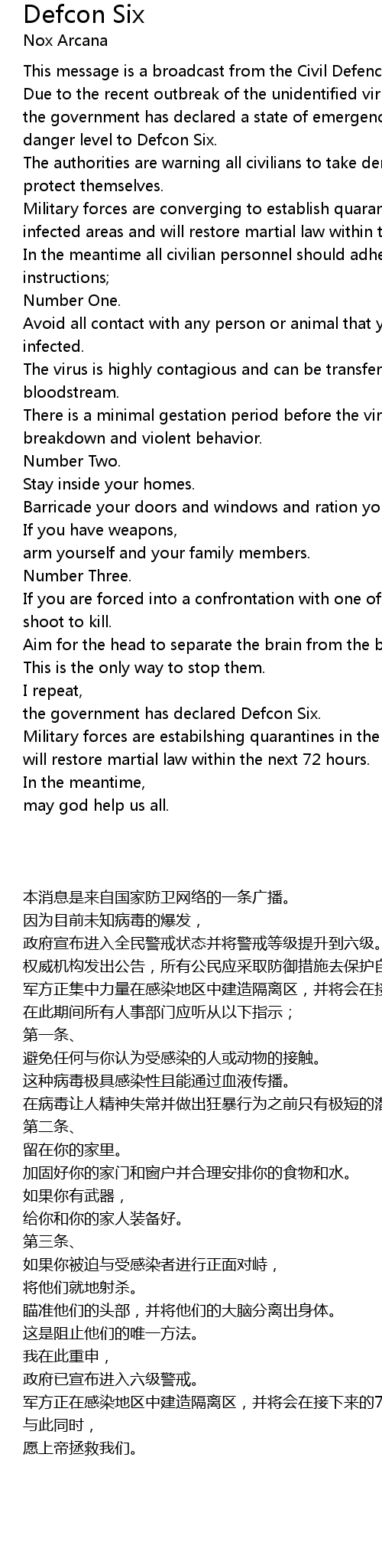 Military forces are converging to establish quarantines in the infected areas and will restore martial law within the next 72 hours. |