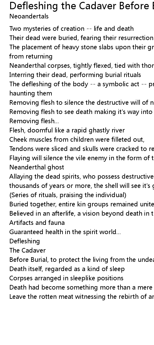Allaying the dead spirits, who possess destructive powers to the continent (For thousands of years or more, the shell will see it's ghostly owner nevermore) (Series of rituals, praising the individual) |