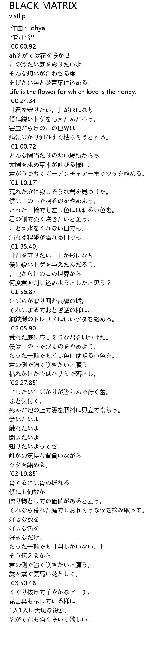 | [03:28.53] | それなら荒れた庭でしおれそうな僕を摘み取って。 |