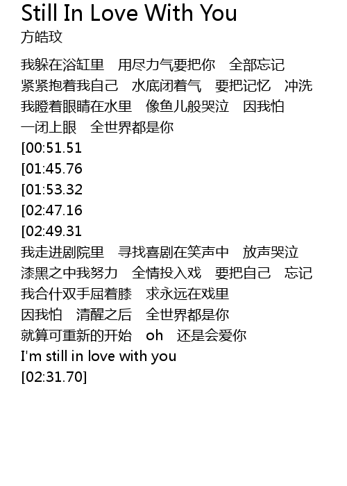| [02:55.03][02:47.16][02:17.13][02:00.84][01:07.16] | I'm still in love with you |