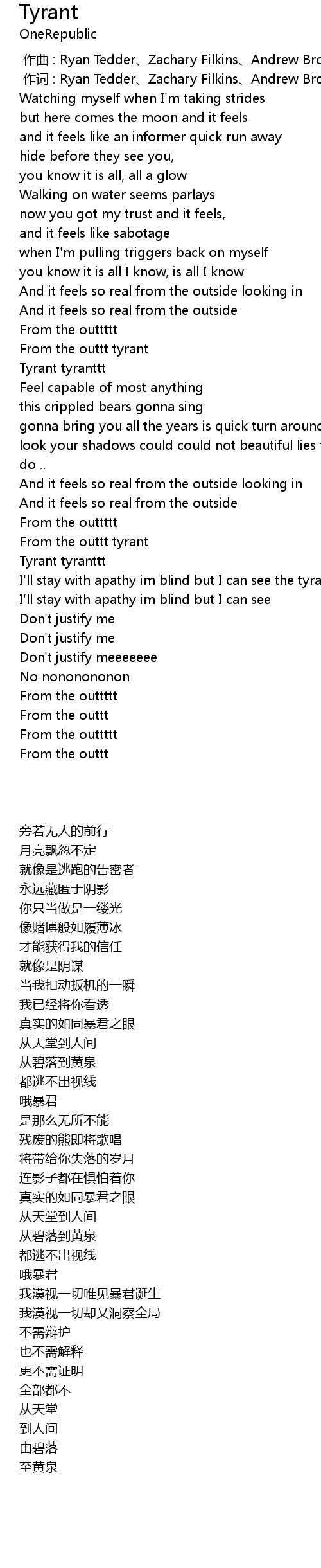 | [00:01.00] | 作词 : Ryan Tedder、Zachary Filkins、Andrew Brown |