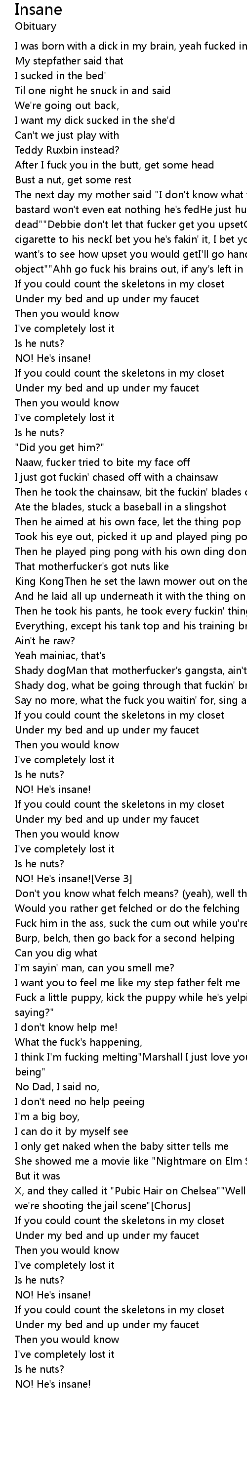 The next day my mother said "I don't know what the fuck's up with this kid!The bastard won't even eat nothing he's fedHe just hung himself in the bedroom he's dead""Debbie don't let that fucker get you upsetGo in there, stick a fuckin' cigarette to his neckI bet you he's fakin' it, I bet youI bet he probably just want's to see how upset you would getI'll go handle this of course, unless you object""Ahh go fuck his brains out, if any's left in his head"[Chorus] |