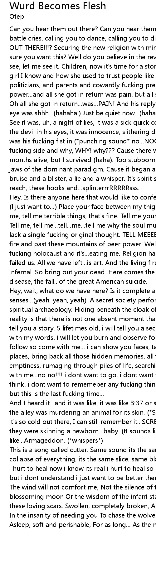 Can you hear them out there? Can you hear them out there? The war drums, the battle cries, calling you to dance, calling you to die. Oh, can you hear them OUT THERE!!!? Securing the new religion with mindless, violent acts. Are you sure you want this? Well do you believe in the revolution? Are you ready? Let me see, let me see it. Children, now it's time for a story. And it's about this girl I know and how she used to trust people like priests and police and politicians, and parents and cowardly fucking presidents and people of power...and all she got in return was pain, but all she got in return was pain. Oh all she got in return...was...PAIN! And his reply, oh with the devil in his eye was shhh...(hahaha.) Just be quiet now...(hahaha.) |
