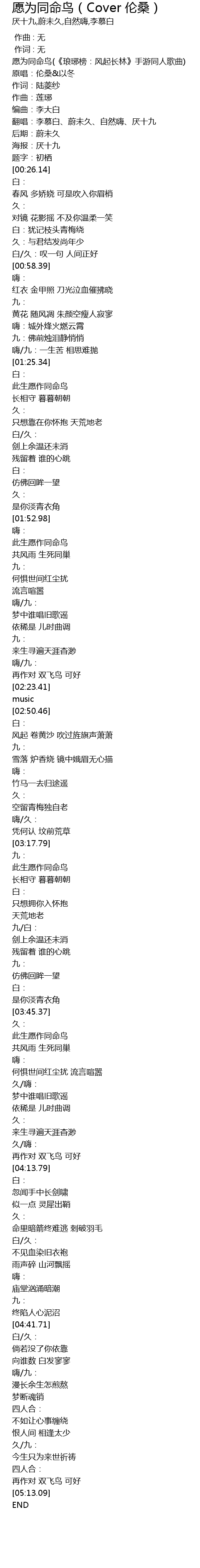| [00:02.54] | 愿为同命鸟(《琅琊榜:风起长林》手游同人歌曲) |