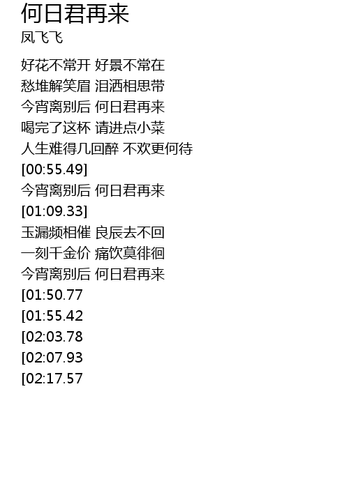 | [02:58.96][02:07.93] | 今宵离别后 何日君再来 |