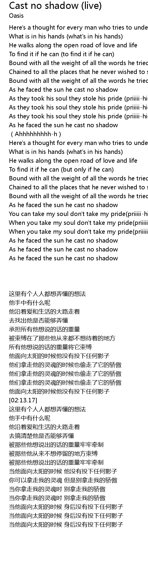 | [02:04.35] | As he faced the sun he cast no shadow |