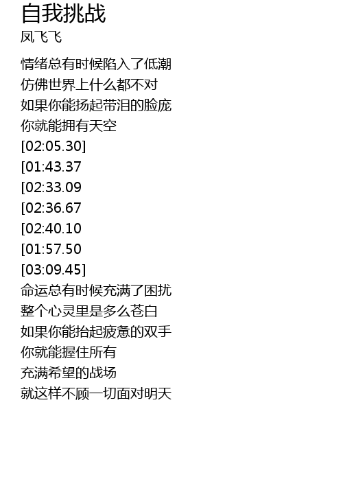 | [02:43.80][01:57.50][01:11.20] | jiu zhe yang bu gu yi qie tiao wang ming tian |