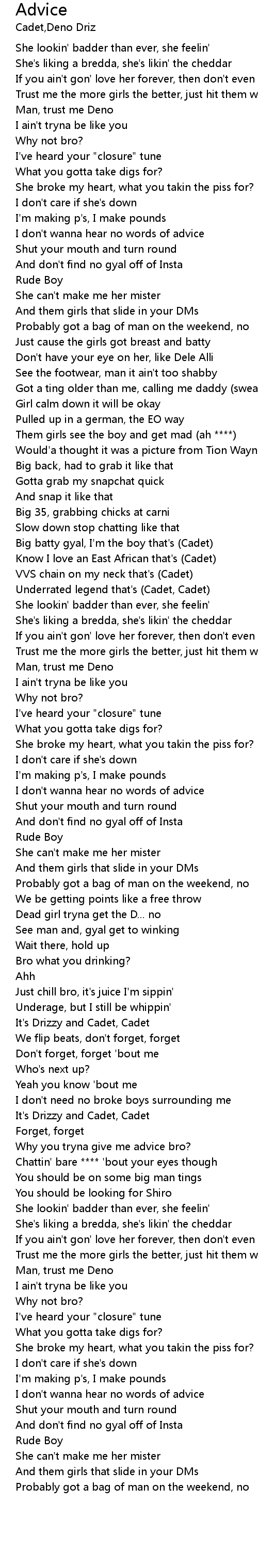 | [00:18.88] | She broke my heart, what you takin the piss for? |