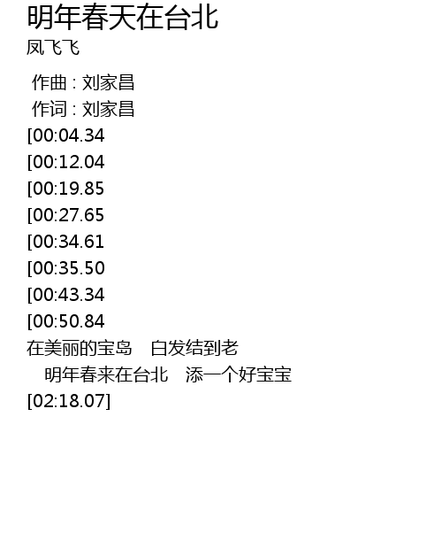 | [01:38.56][00:43.34] | 明年春来在台北 添一个好宝宝 |