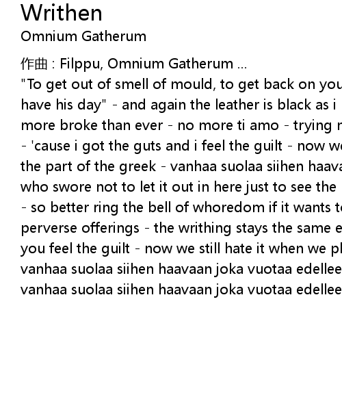 | " To get out of smell of mould, to get back on your feet again let every god have his day" and again the leather is black as i lie on fragments of glass, more broke than ever no more ti amo trying not to hate the guts we all have ' cause i got the guts and i feel the guilt now we still hate it when we play the part of the greek vanhaa suolaa siihen haavaan joka vuotaa edelleen and who swore not to let it out in here just to see the boots rot away in one' s feet so better ring the bell of whoredom if it wants to ring, or just forget all perverse offerings the writhing stays the same even if you got the guts and you feel the guilt now we still hate it when we play the part of the greek vanhaa suolaa siihen haavaan joka vuotaa edelleen minne sattuu ihmiseen vanhaa suolaa siihen haavaan joka vuotaa edelleen |