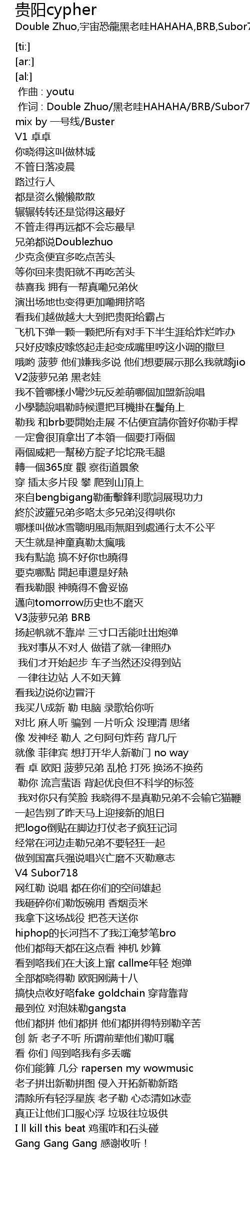 | [00:01.000] | 作词 : Double Zhuo/黑老哇HAHAHA/BRB/Subor718 |