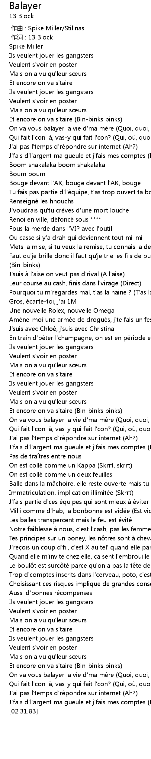 | [00:47.26] | Faut qu'je brille donc il faut qu'je trie les fils de putes en route (Bin-binks) |
