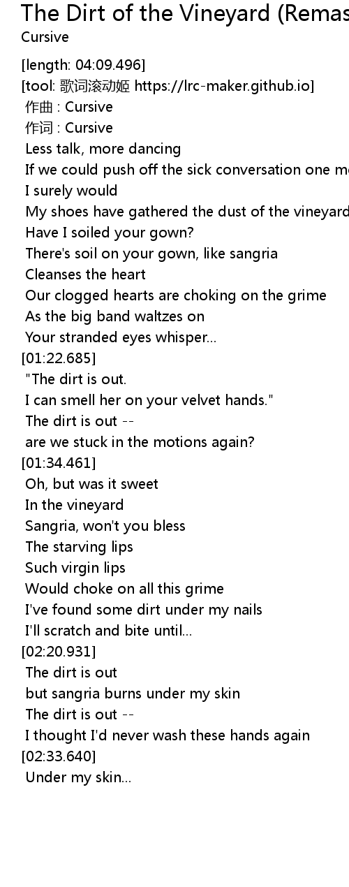| [00:53.075] | There's soil on your gown, like sangria |