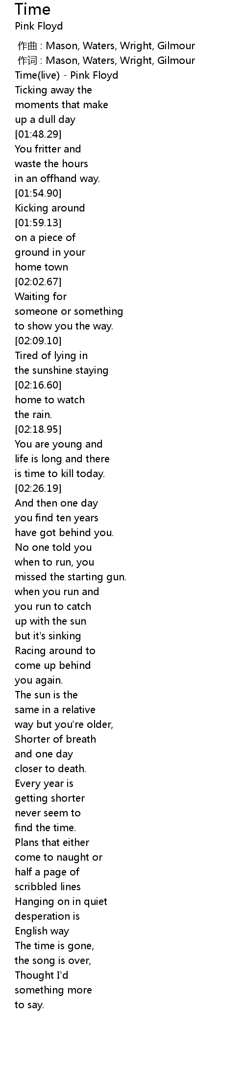 | [00:00.00] | zuò qǔ : Mason, Waters, Wright, Gilmour |