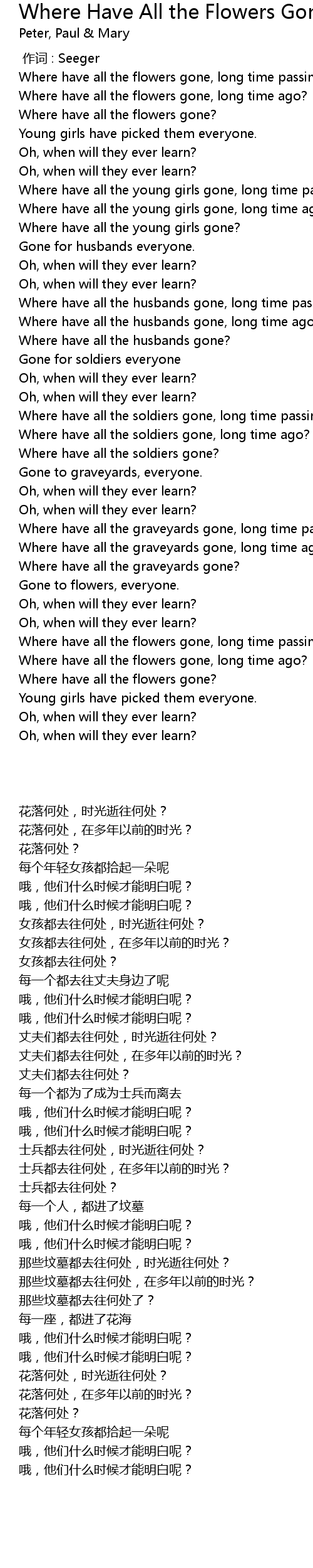 | [00:16.96] | Where have all the flowers gone, long time ago? |